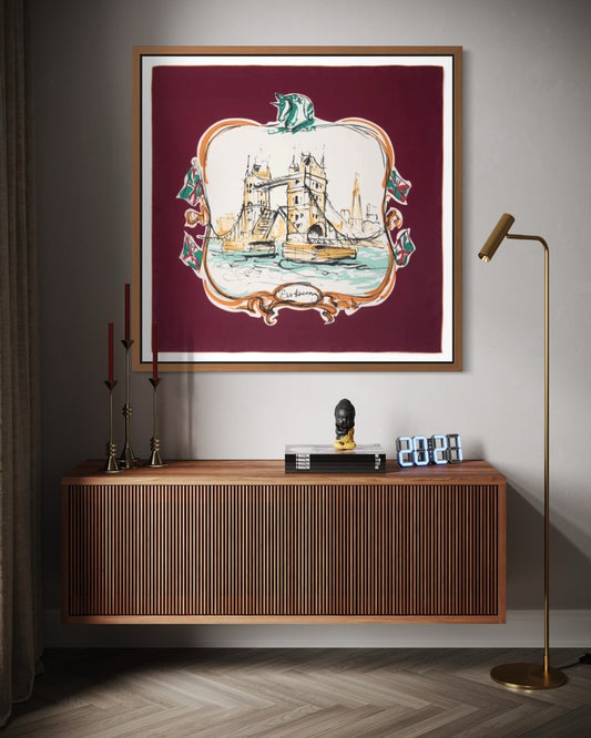 Using archival techniques from textile conservation, we developed a non-destructive, gallery-grade process that protects the fabric and preserves the hand-rolled edges. The result is a curated collection of designer silk scarves – from rare Hermès Carrés to limited editions by Louis Vuitton, Gucci and more – transformed into striking, ready-to-hang artworks for residential and commercial spaces.