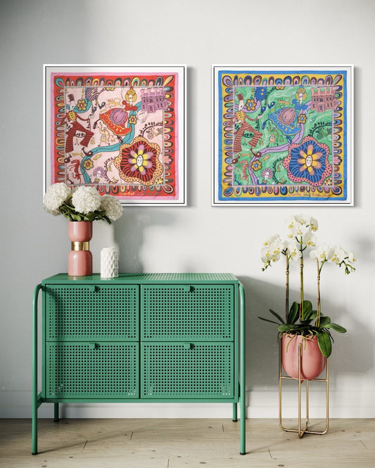 Working with interior designers, collectors and fashion-led clients, our framed scarves bring colour, heritage and character into modern homes.