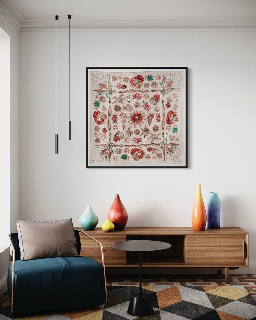 This piece is available for immediate purchase in our signature crisp white deep shadow box frame. To discuss alternative framing options, please contact our team at info@framedsilkscarves.com. Please note that the dimensions provided are approximate. All photographs are taken in natural light; colours may vary slightly from those shown. Each scarf is individually hand-sewn and framed, so alignment may differ subtly from the displayed image.