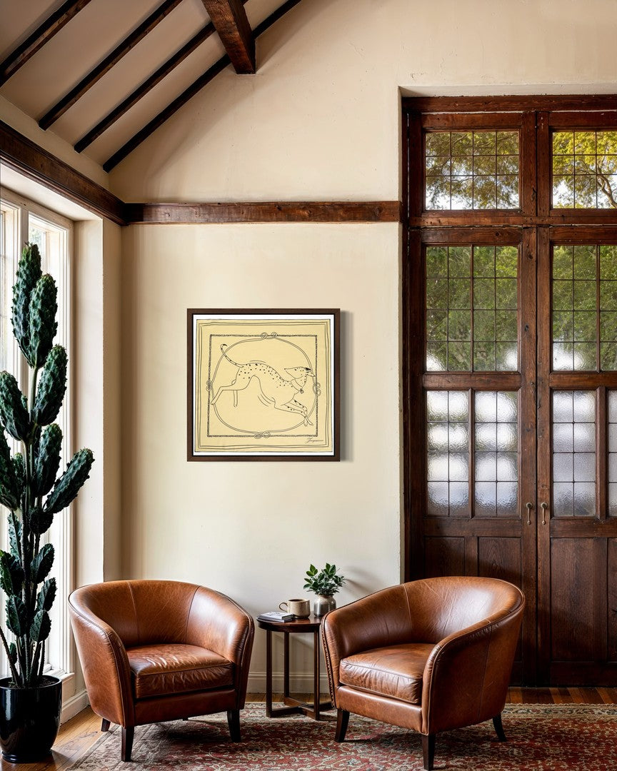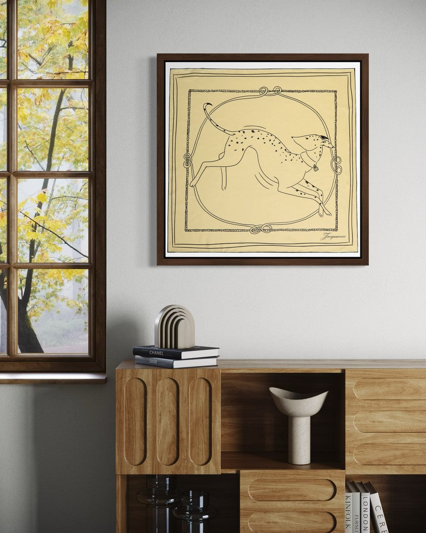 The Dalmatian scarf is a playful exploration of pattern, form, and movement rendered in silk. Its pale yellow canvas is animated by a lively Dalmatian motif, each figure rendered with a sense of personality and motion. The repetition of the dogs across the surface creates rhythm and energy, transforming the fabric into a dynamic visual composition.