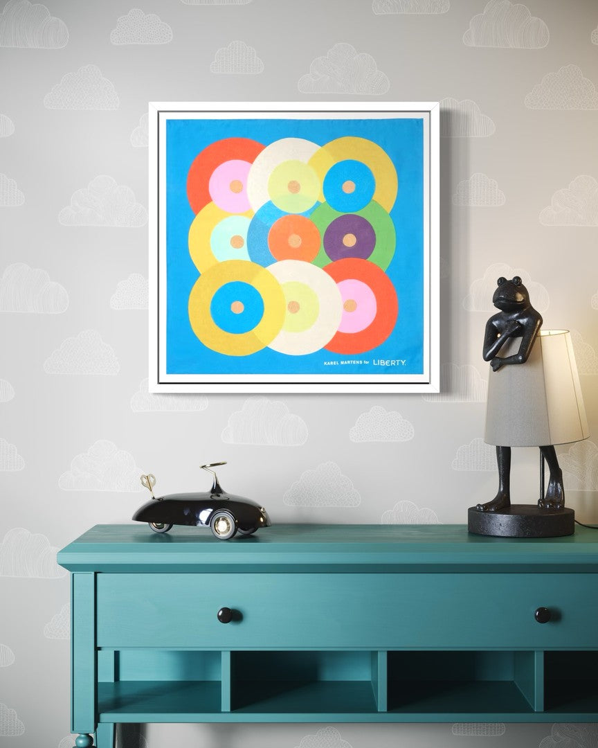 The rich palette of harmonious hues is enhanced by the silk’s natural sheen, giving the print depth and a subtle, luminous quality that shifts beautifully with light. Each curve and line is meticulously arranged, reflecting Liberty’s signature attention to detail and mastery of textile design. When displayed as a framed piece, the scarf transcends its wearable function, becoming a striking work of art that invites contemplation. Perfect for contemporary interiors or as a statement collector’s piece, it celebrates the artistry of pattern, colour, and the timeless allure of silk.
