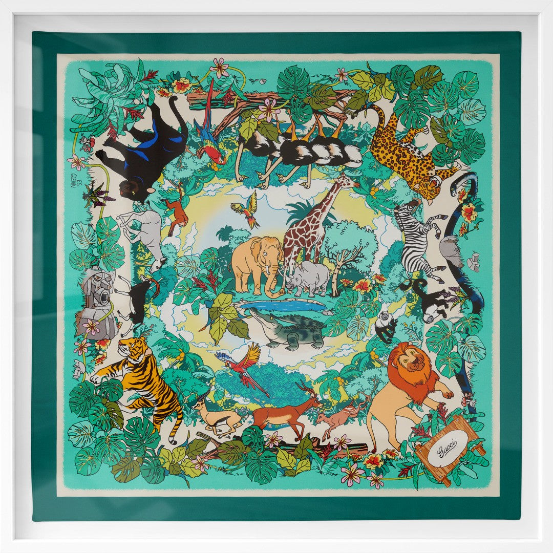 Featuring artwork by multidisciplinary artist Everett .S. Glenn, this limited-edition carré was created for Gucci’s 90 x 90 Project. Known for blending comics, painting, and performance, Glenn brings a deeply personal lens to the natural world — rendering plants and animals in vivid, gestural detail. Printed on multicolour silk twill, the design captures a raw, expressive energy that’s both contemporary and poetic.