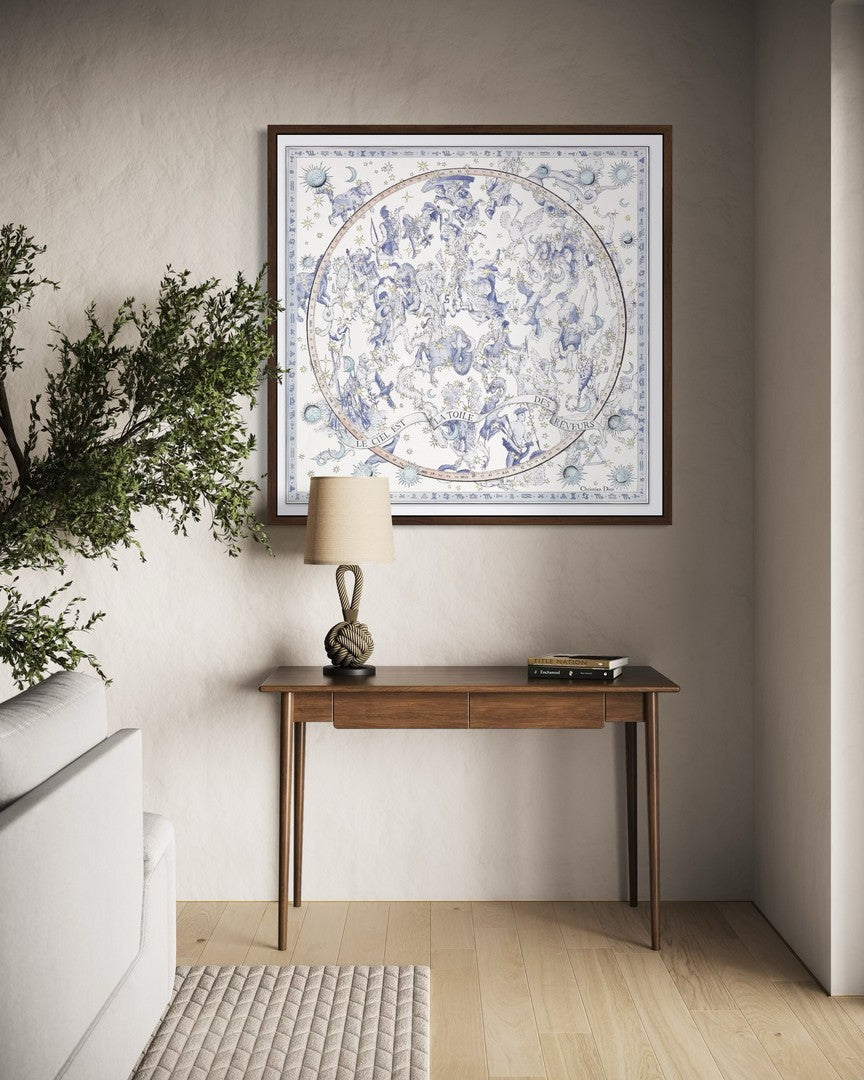 The precision of its linework and the depth of its shading reveal exceptional craftsmanship, while the double-sided silk twill construction adds a unique visual richness. Each side offers its own interpretation of the dream, one in radiant white and the other in serene blue, creating subtle variations in tone and atmosphere.