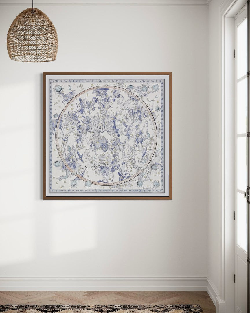 Rendered in luminous shades of white and blue, the scarf reveals a tableau of poetic detail. Winged horses soar among celestial bodies, fantastical sea creatures drift through constellations, and delicate zodiac symbols frame the scene like an ancient cosmic map. At the heart of the composition, the inscription “Le ciel est la toile des rêveurs”, meaning “The sky is a canvas for dreamers”, serves as both message and muse, evoking Dior’s enduring dialogue between imagination and beauty.